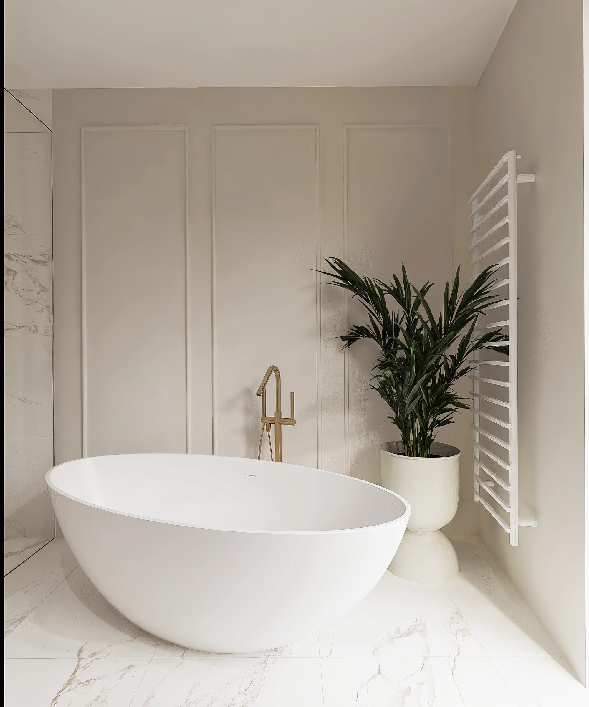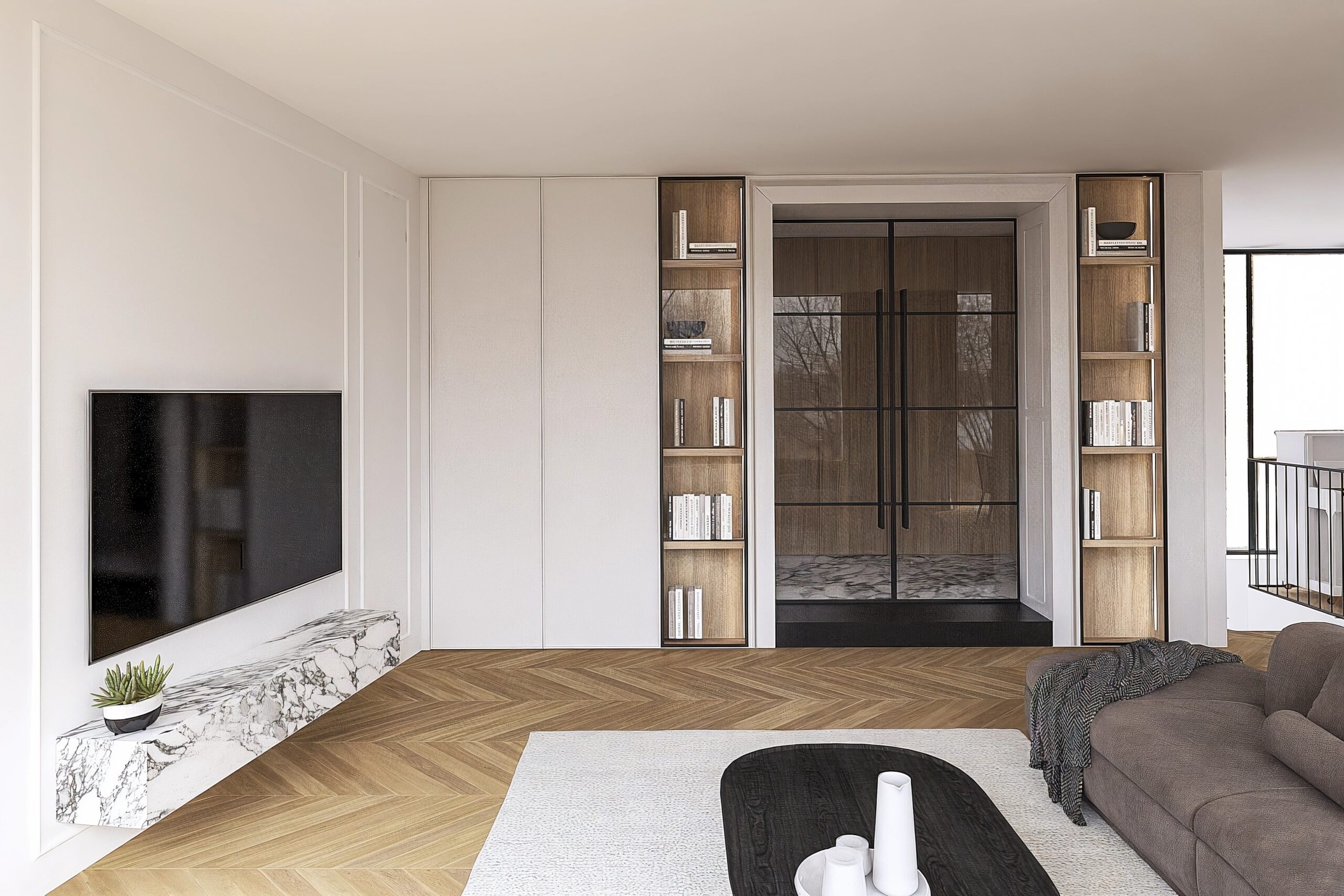 Dnevna soba je namenjena sprostitvi in hkrati branju – tu prevladuje večja knjižna vitrina, ki zagotavlja prostor za vse najljubše knjige. Zaobljena sedežna garnitura v kombinaciji z marmornato mizico ustvarja intimno in udobno središče dnevnega prostora, medtem ko dvojno steklena vrata s črnimi okvirji prostoru dodajo prefinjen arhitekturni poudarek.
